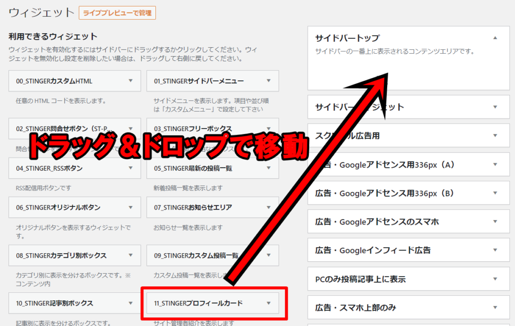 「利用できるウィジェット」内にある「STINGERプロフィールカード」をサイドバートップへ移動します。