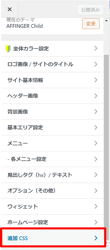 外観>カスタマイズ>追加CSS を開いて編集していきます。