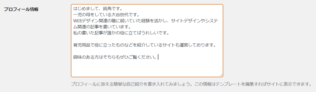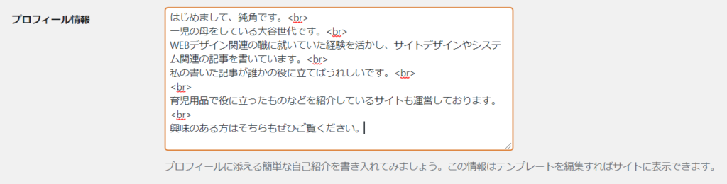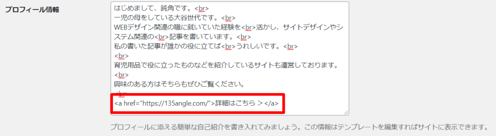プロフィール情報にリンクを表示させたい場合はHTMLタグを書く必要がありますが、デフォルトではプロフィール情報にHTMLタグを書いてもそのまま表示されてしまいます。